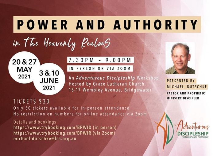 Grace Church, Bridgewater (plus Zoom) 15 Wembley Avenue, Bridgewater, SA, Australia$30/person Booking required; details in the flyer